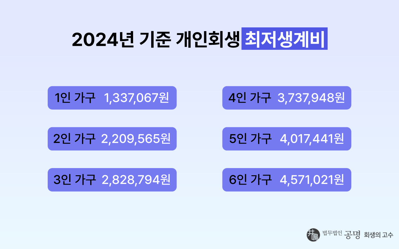 개인회생 절차에서 부양가족 인정 여부는 최저생계비에 더해 추가 생계비와 관련이 있기 때문에 매우 중요합니다. 2024년 최저생계비를 확인해 보며, 말씀드리겠습니다.